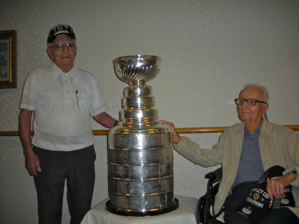 Desire ''Dave'' Caissie, age 104, (right) shares his moment with the Stanley Cup at St. Patrick's Manor with his brother Max, (at left). Max is just a kid at only 92 years old!