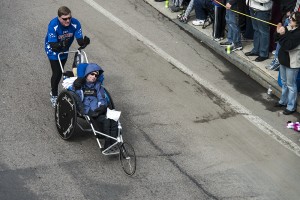 Dick & Rick Hoyt as they pass through Downtown Framingham during the 2013 Boston Marathon. (photo courtesy of Wayne Dion, www.dion.com)
