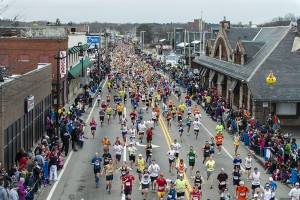 Hordes of runners approach the Rt. 126 / Rt. 135 intersection in Downtown Framingham during the 2013 Boston Marathon, (photo courtesy of Wayne Dion, www.dion.com)
