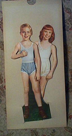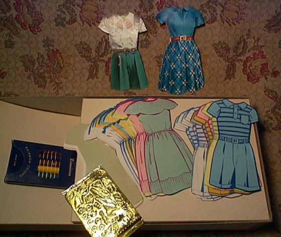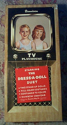 DENNISON TV PLAYHOUSE STARRING THE DRESS - A - DOLL DUET TWO STAND UP DOLLS FULL COLOR COSTUMES COSTUMES TO COLOR RAINBOW CRAYONS. (NO.522), Dennison Manufacturing Co., Framingham, Massachusetts, USA The 13" x 6" box had a cellophane "TV screen", (for the purpose of putting on a puppet like television show), a boy and a girl 10" doll, stands, crayons, a sheet of gold foil accessories (for decorating the outfits - cowboy gun, belts, flowers, bows etc), and "ready to color or decorate" paper outfits for the dolls in various colors and (white) blank outfits so you could design your own, also found with the set was a transparent template for cutting more outfits out of your own materials. ![]() ![]() ![]() ![]() Copyright ©1995-2001 framingham.com, all rights reserved. |