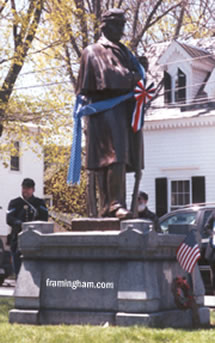 While in pursuit of a new Girl Scout Save Outdoor Sculpture!(SOS!) patch, the troop raised awareness of the need to rescue the eroding statue. The troop. guided by Assistant Troop Leader Charlene Frary, inspired parents, friends, the Framingham Tercentennial Commission, Framingham students, and Civil War reenactors to work on and donate funds for the statue's cleaning and conservation. Their combined efforts raised the $ 16,000 needed through grants and many, many private parties. The troop won several awards. They were the first troop in the U.S. to receive the SOS! patch. They also were recognized with awards from SOS!, including the 2000 SOS! National Award for Community Awareness in a Project. Their efforts were so outstanding that representatives from The National Endowment for the Arts, The Museum of Fine Arts, and the Massachusetts Historical Commission, as well as SOS!sponsor Target Stores, attended the rededication ceremony on April 28. The