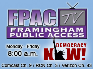In Framingham, Democracy Now!, (and other FPAC-TV programming), can be viewed on public access channels Comcast 9, RCN 3, and Verizon 43.