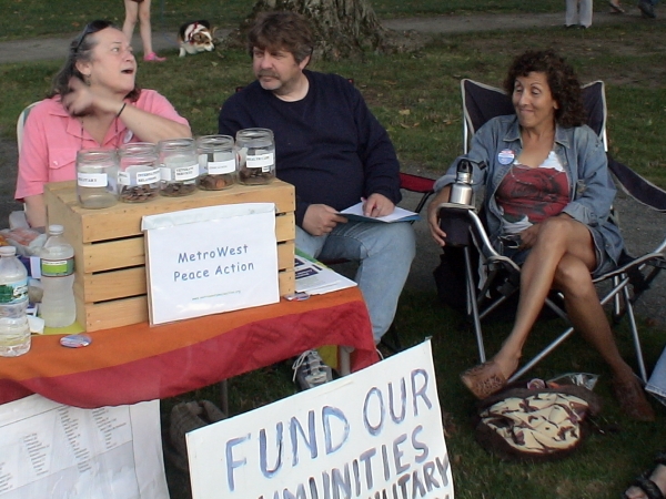 Among the community groups setup on the common MetroWest Peace Action, (www.MetroWestPeaceAction.org), had a table full of information and was holding an informal "Pennie Poll".