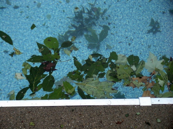 On August 28, 2011 leaves and twigs whipped up by winds from Hurricane Irene cover this swimming pool in Framingham. Roads, cars, lawns, roofs -- everything in town was scattered with debris.