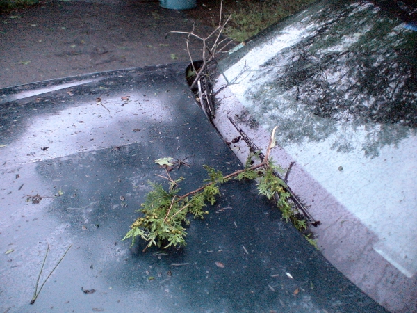 Bits of leaves, pine needles and small branches torn from trees by Hurricane Irene's winds cover this car's hood in Framingham. (August 28, 2011)