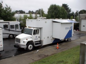 FEMA and Dept. of Homeland Security mobile command centers meet at the MEMA bunker in Framingham to coordinate emergency efforts for Hurricane Irene (Aug. 2011)