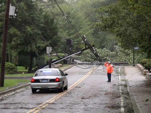 Framingham Police and NStar Utility crews secure area on Salem End Road near Temple Street where a large tree blown over by Hurricane Irene snapped two utility poles. (August 28, 2011)