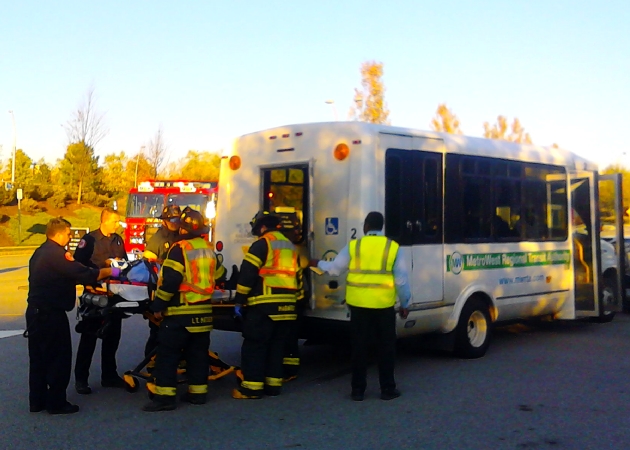 MWRTA bus passenger is carried off bus via rear door by EMTs and Fire Fighters.