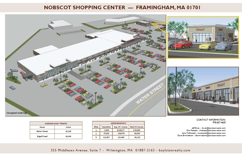 For additional information or to inquire about leasing space in the shopping center, contact Jeff Bruk, Boylston Realty Advisors, 355 Middlesex Avenue, Suite 7, Wilmington, MA 01887, tel: (978) 657-4600 extension 3131, or email: jbruk@boylstonrealty.com or visit the Boylston Realty website at: www.boylstonrealty.com