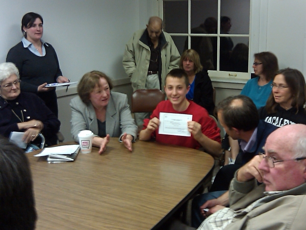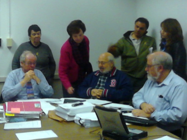 Betty Muto, (standing, center), Precinct 12 TM Chair and Member of the Real Property Committee argues with the Framingham Board of Health to withhold a permit for FHS student Peter Jacobson to keep six chickens at his home -- Muto citing the possibility of future zoning or bylaw changes which may not allow residents to keep chickens at all in residential areas.