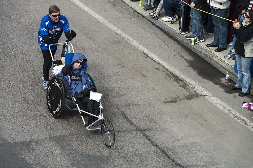 Dick & Rick Hoyt as they pass through Downtown Framingham during the 2013 Boston Marathon. (photo courtesy of Wayne Dion, www.dion.com)