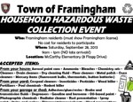 FRAMINGHAM, MA – The Town of Framingham has announced the details of the 2013 “Household Hazardous Waste Day” which will be held Saturday, September 28, 2013, at McCarthy Elementary, 8 Flagg Drive from 9:00am – 1:00pm, (with NO late arrivals!) The recycling and disposal program is open to Framingham residents only, (who must show Framingham license). There… [read more].