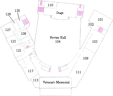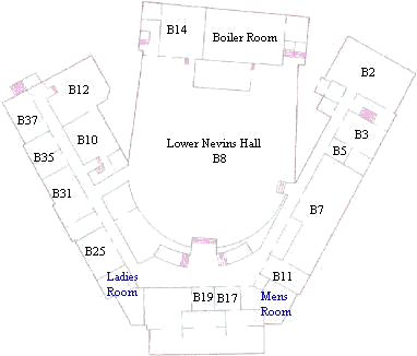 B2 - Planning Department B5 - Housing Rehabilitation Dept. B7 - Human Resources Dept. B8 - LOWER NEVINS HALL- has been divided up into meeting rooms. B8 - B10 - Bldg. & Wire B11 - Payroll Office B14 - LIFT Transportation Office B17 - MIS B25, B35 - B31 - Retirement B35 - Human Relations B37 - Planning Board RESTROOMS |